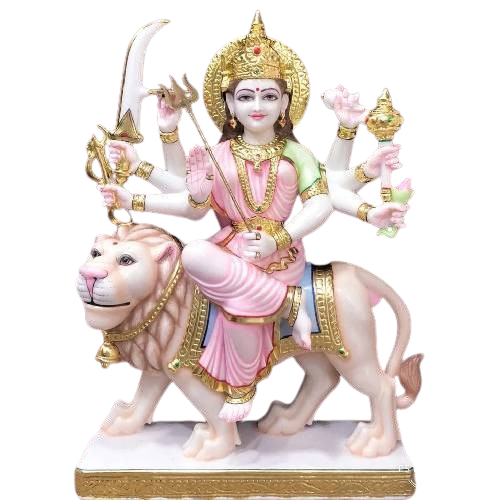 The use of high-grade white marble gives the statues a radiant finish, symbolizing purity and divine energy. Many of these statues feature Goddess Durga seated majestically on her lion, her multiple hands holding various symbolic weapons like the trident (Trishul), conch (Shankha), and lotus flower, signifying her power to protect, nurture, and bestow blessings. The calm yet powerful demeanor of the goddess is captured beautifully, making these statues an ideal focal point for spiritual worship.