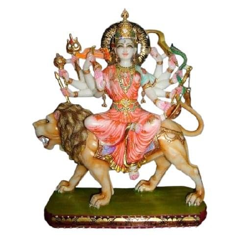 Carved from high-quality marble, the statue is adorned with intricate detailing and vibrant color coatings that bring the divine form of Durga to life. The goddess is depicted in her traditional pose, seated majestically on a lion, holding various weapons in her hands, each symbolizing different aspects of power and protection. The statue showcases the embodiment of strength, courage, and motherhood, all of which are central to the depiction of Durga in Hindu mythology.